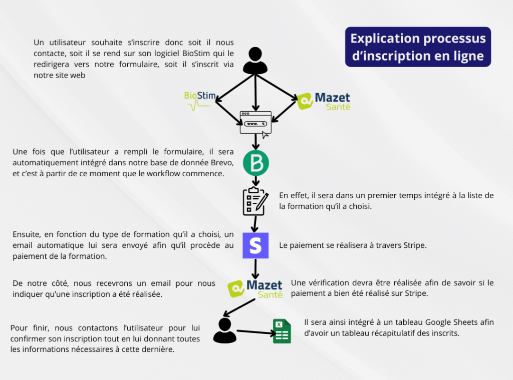 Optimisation & automatisation des inscriptions en ligne Pour simplifier l’expérience utilisateur et gagner du temps, j’ai automatisé l’ensemble du processus d’inscription avec Brevo.Avant : Inscriptions papier, longues et sources d’erreursAprès : Workflow automatisé avec confirmations, rappels et suivisRésultat : Processus fluide, rapide et sans erreurs — un vrai gain de temps pour l’équipe Contenu créé pour l'automatisation Outils utilisés